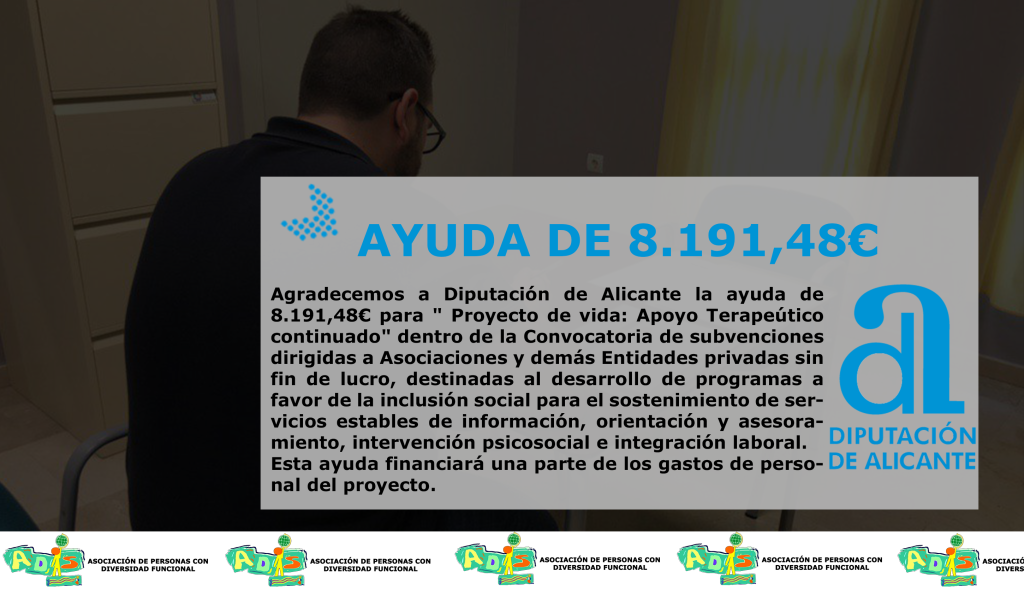 8.191,48€ para «Proyecto de vida: Apoyo Terapeútico continuado» dentro de la Convocatoria de subvenciones dirigidas a Asociaciones y demás Entidades privadas sin fin de lucro, destinadas al desarrollo de programas a favor de la inclusión social para el sostenimiento de servicios estables de información, orientación y asesoramiento, intervención psicosocial e integración laboral.