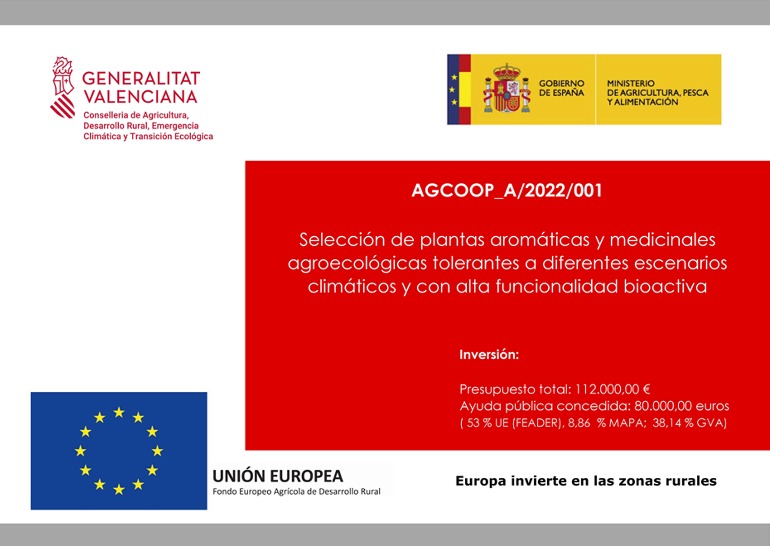 Bajo este contexto, se desarrolla el proyecto titulado “Selección de plantas aromáticas y medicinales agroecológicas tolerantes a diferentes escenarios climáticos y con alta funcionalidad bioactiva” AGCOOP_A/2022/001, financiado por la Conselleria de Agricultura, Medio Ambiente, Cambio Climático y Desarrollo Rural en su programa para la cooperación en el marco del Programa de desarrollo rural de la Comunitat Valenciana 2014-2020.